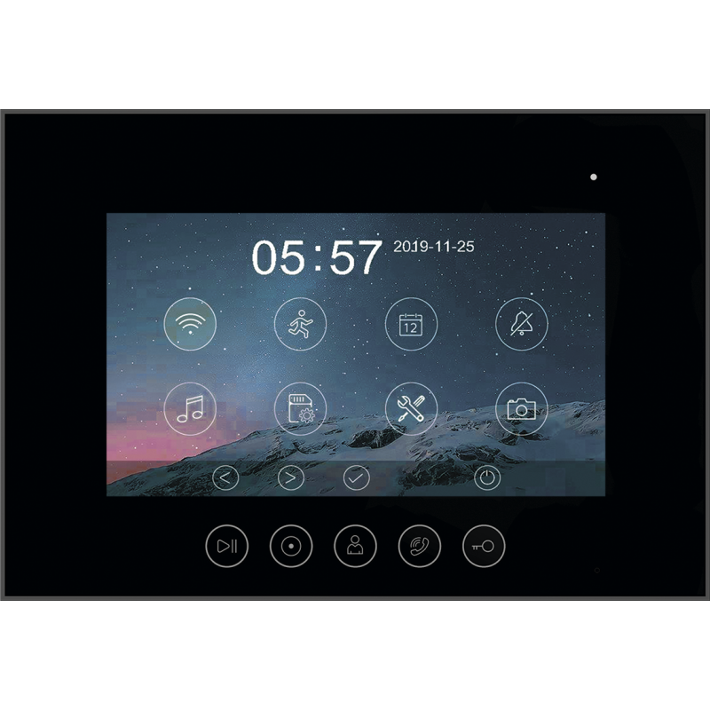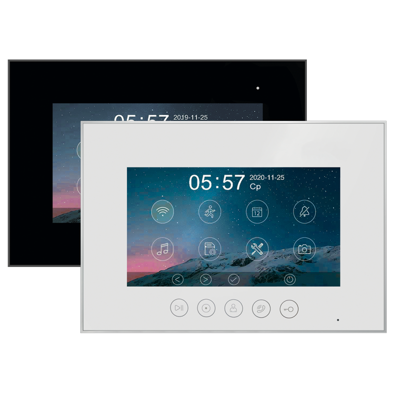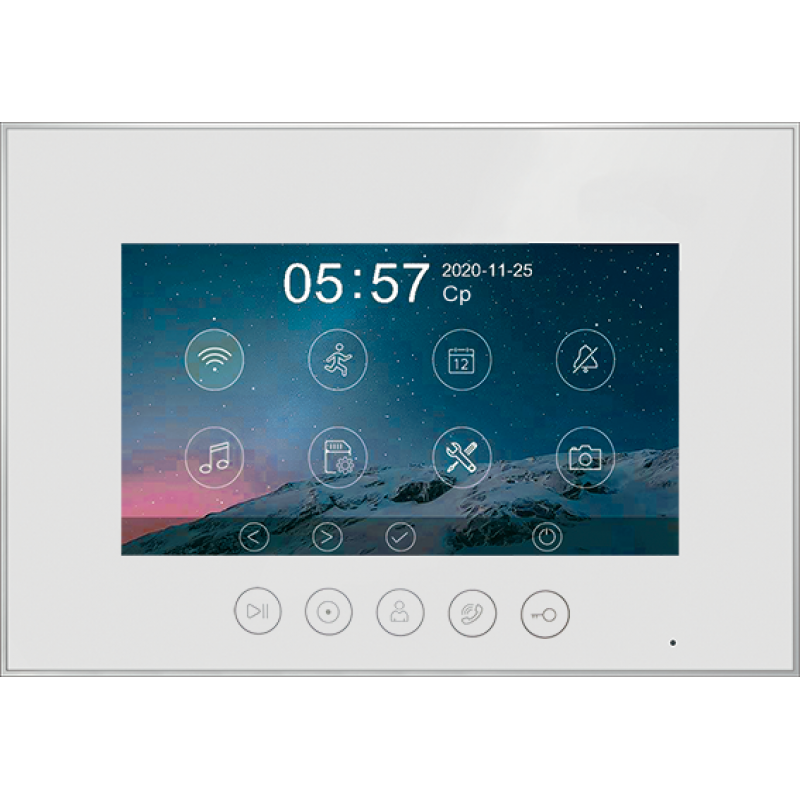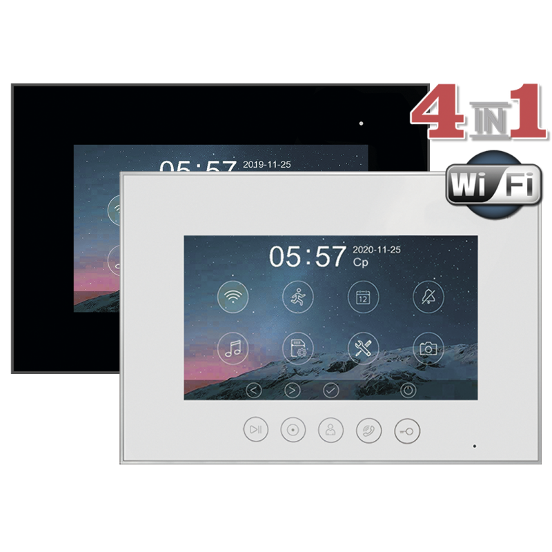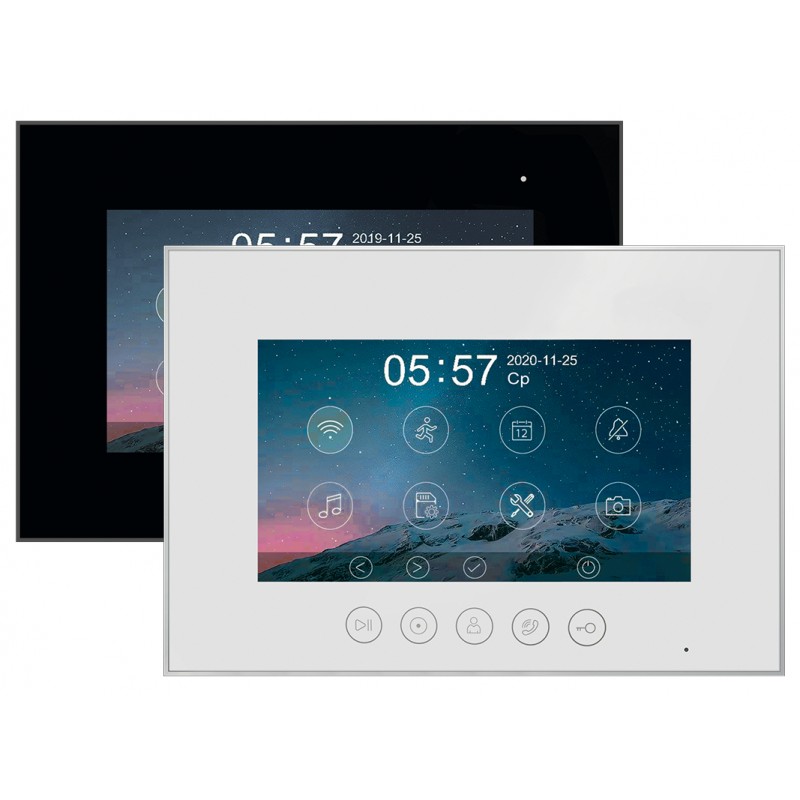 Данная модель оснащена 7-дюймовым сенсорным TFT IPS дисплеем с разрешением 1080p/720p. Встроенный модуль Wi-Fi позволяет просмотреть изображение с вызывных панелей, ответить на вызов, открыть электрозамок на калике или воротах через мобильное приложение "vhOme". К устройству можно подключить 2 вызывные панели, 2 камеры видеонаблюдения и 4 дополнительных мониторов (либо 6 мониторов Marilyn HD или MIA HD). В видеодомофоне присутствует функция детекции движения. Устройство способно самостоятельно записывать изображение с видеокамер и сохранять на карту памяти. Поддерживаются SD карты ёмкостью до 128 Гб. Габариты: 222х154х15мм (без кронштейна). Блок питания встроен внутрь домофона.