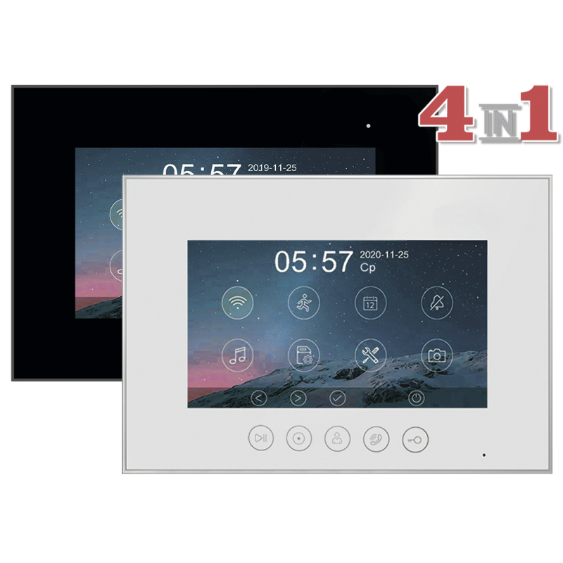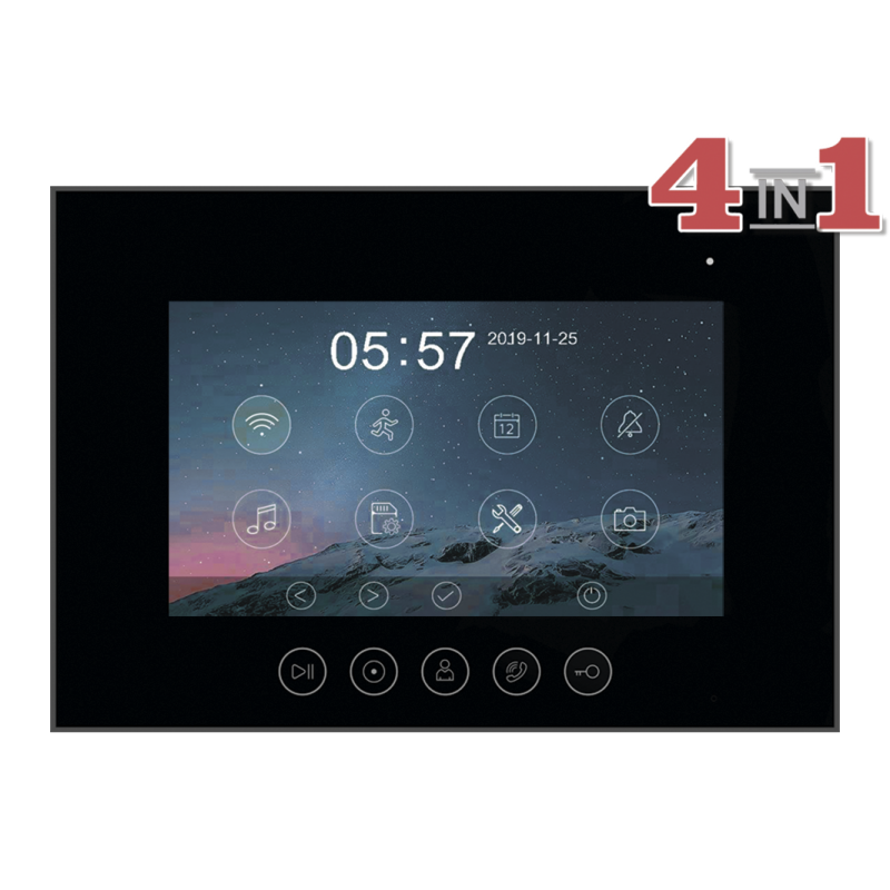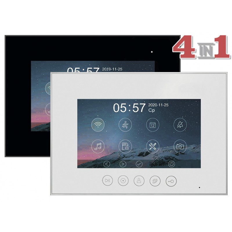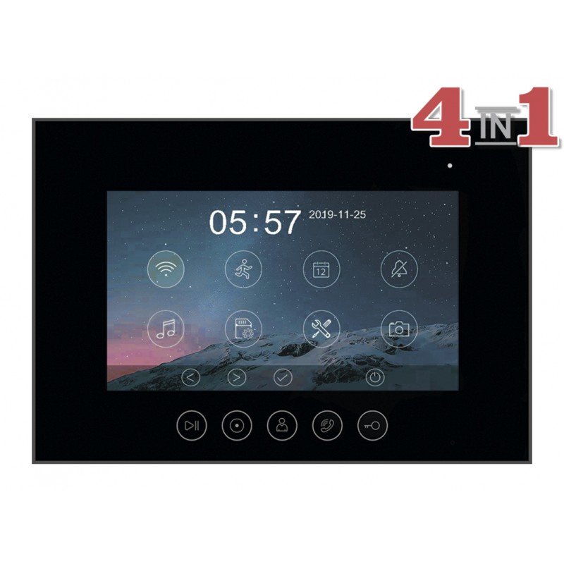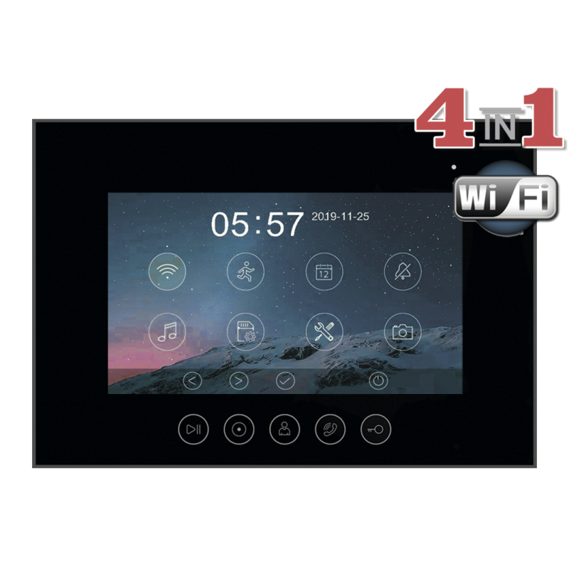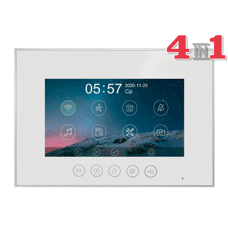 Данная модель оснащена 7-дюймовым сенсорным TFT IPS дисплеем с разрешением 1080p/720p. Встроенный модуль Wi-Fi позволяет просмотреть изображение с вызывных панелей, ответить на вызов, открыть электрозамок на калике или воротах через мобильное приложение "vhOme". К устройству можно подключить 2 вызывные панели, 2 камеры видеонаблюдения и 4 дополнительных мониторов (либо 6 мониторов Marilyn HD или MIA HD). В видеодомофоне присутствует функция детекции движения. Устройство способно самостоятельно записывать изображение с видеокамер и сохранять на карту памяти. Поддерживаются SD карты ёмкостью до 128 Гб. Габариты: 222х154х15мм (без кронштейна). Блок питания встроен внутрь домофона.